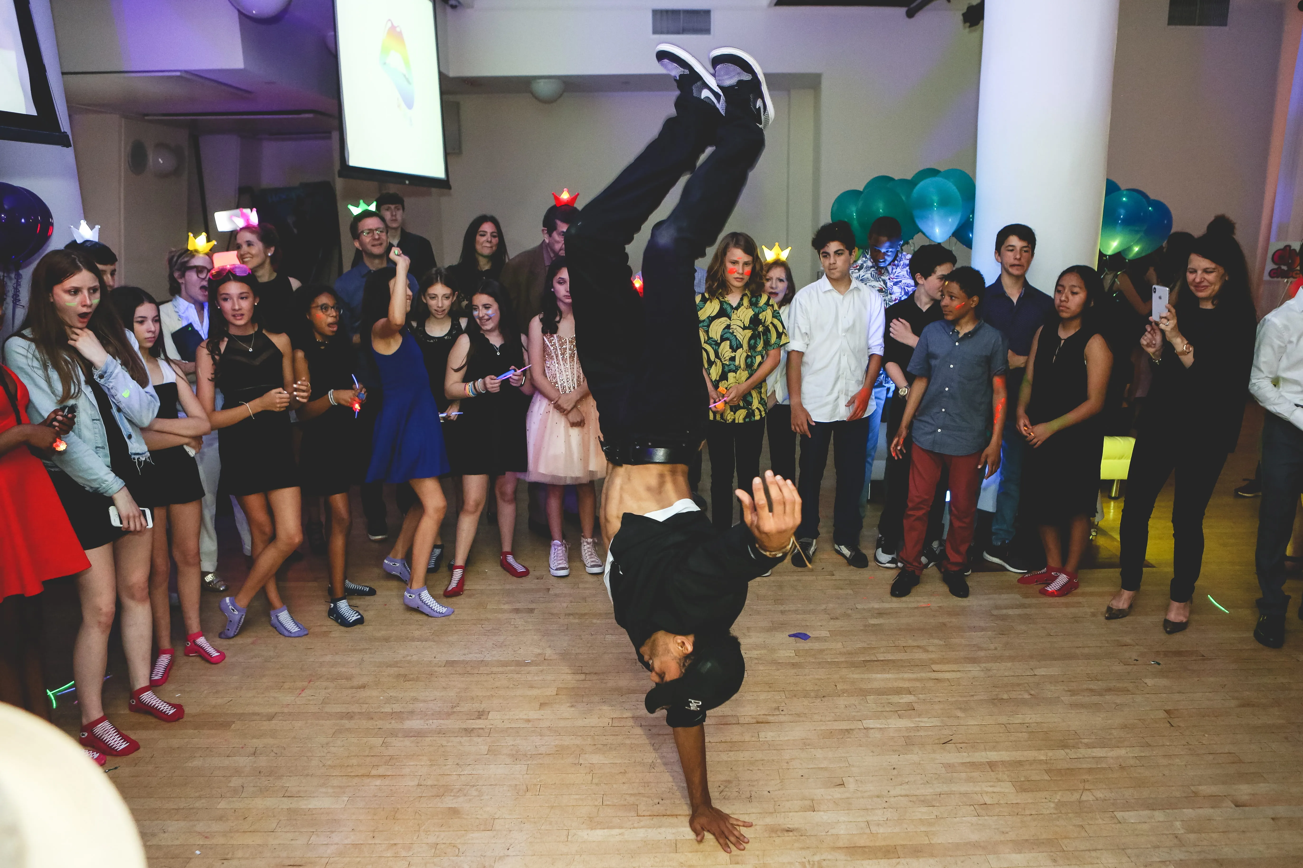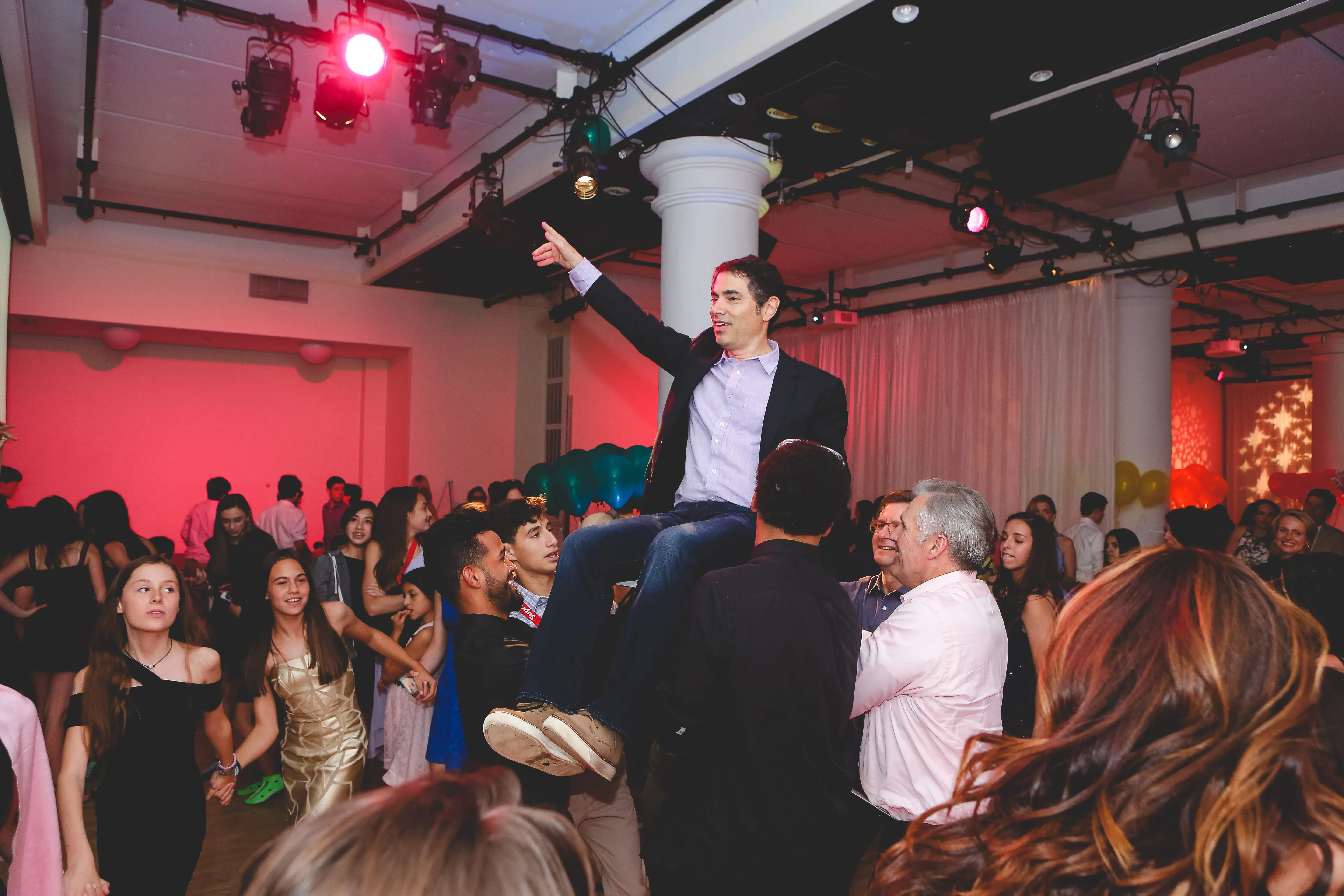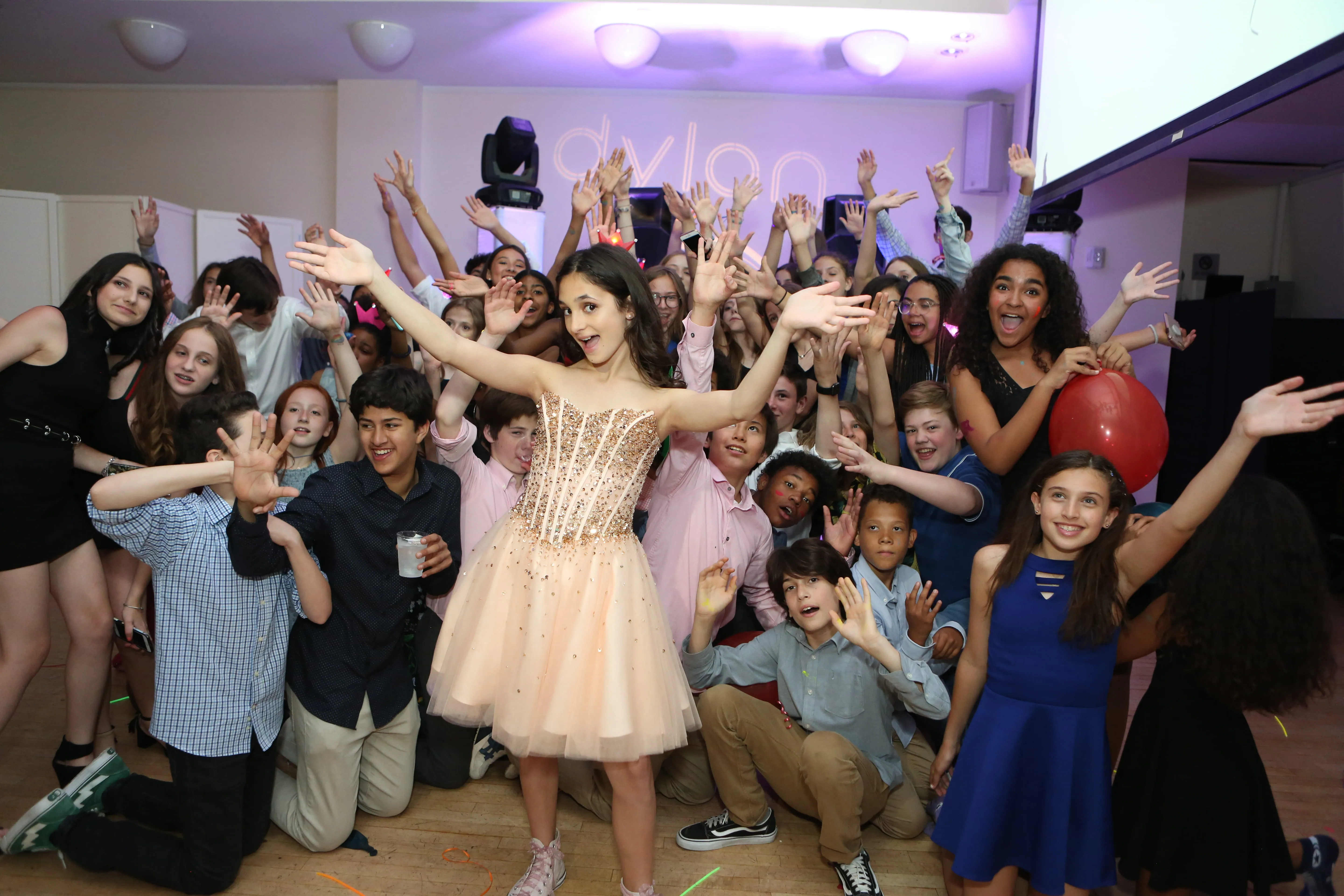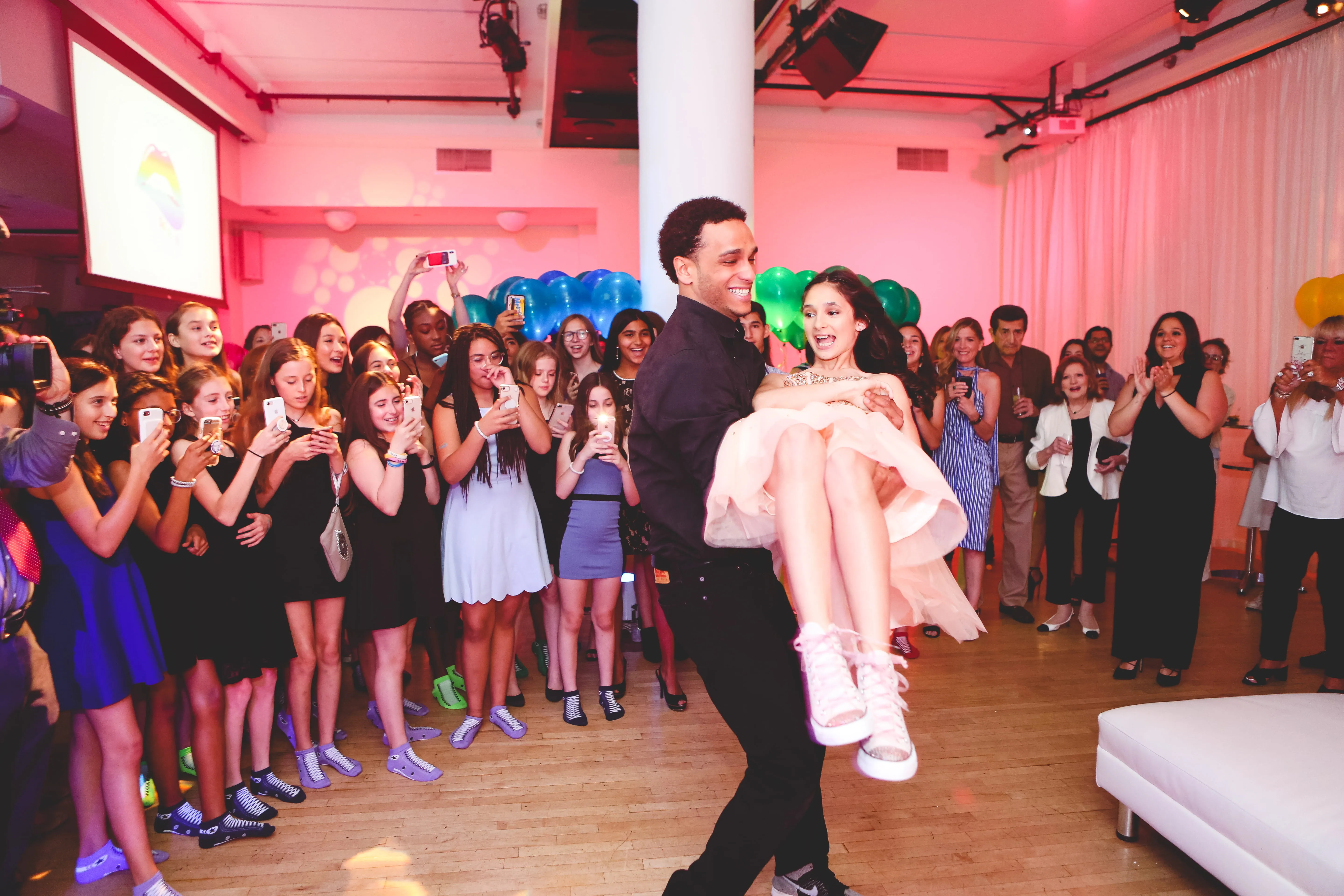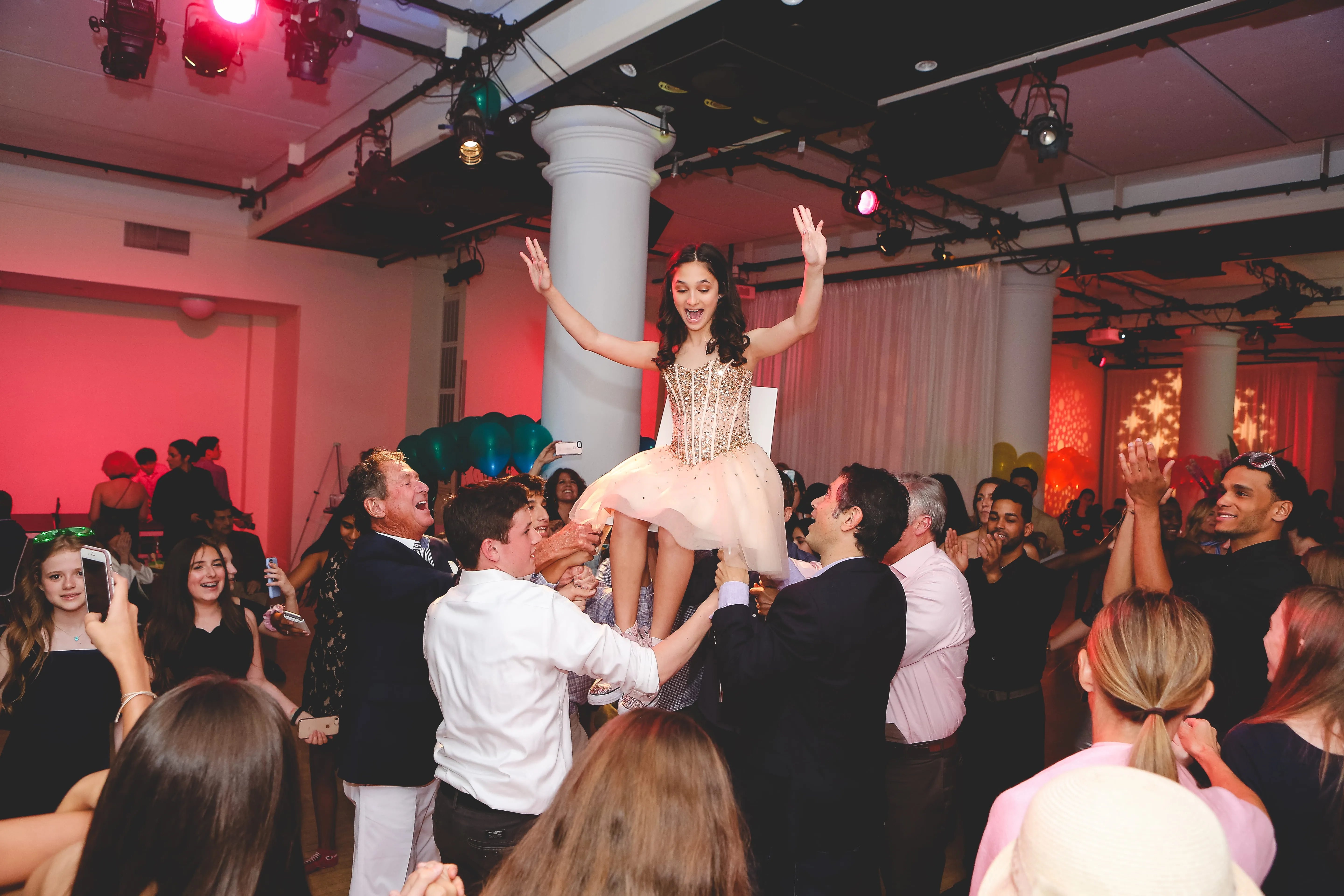When Rob Hines Entertainment took on this bat mitzvah project, the goal was to transform a traditional theater space into a vibrant party atmosphere. Utilizing dynamic lighting techniques, they completely morphed the venue into the pink color scheme Dylan envisioned, while also creating a seamless transition between the cocktail hour and reception. This setup allowed parents and kids to enjoy their separate spaces effectively. Rob Hines Entertainment managed to bring in a skilled magician to entertain guests during the cocktail hour and arranged for spectacular party motivators (break dancers) to perform right after the candle ceremony. The horah was a massive success, as were all the interactive games, with one lucky attendee winning Beats headphones for best dance moves!
