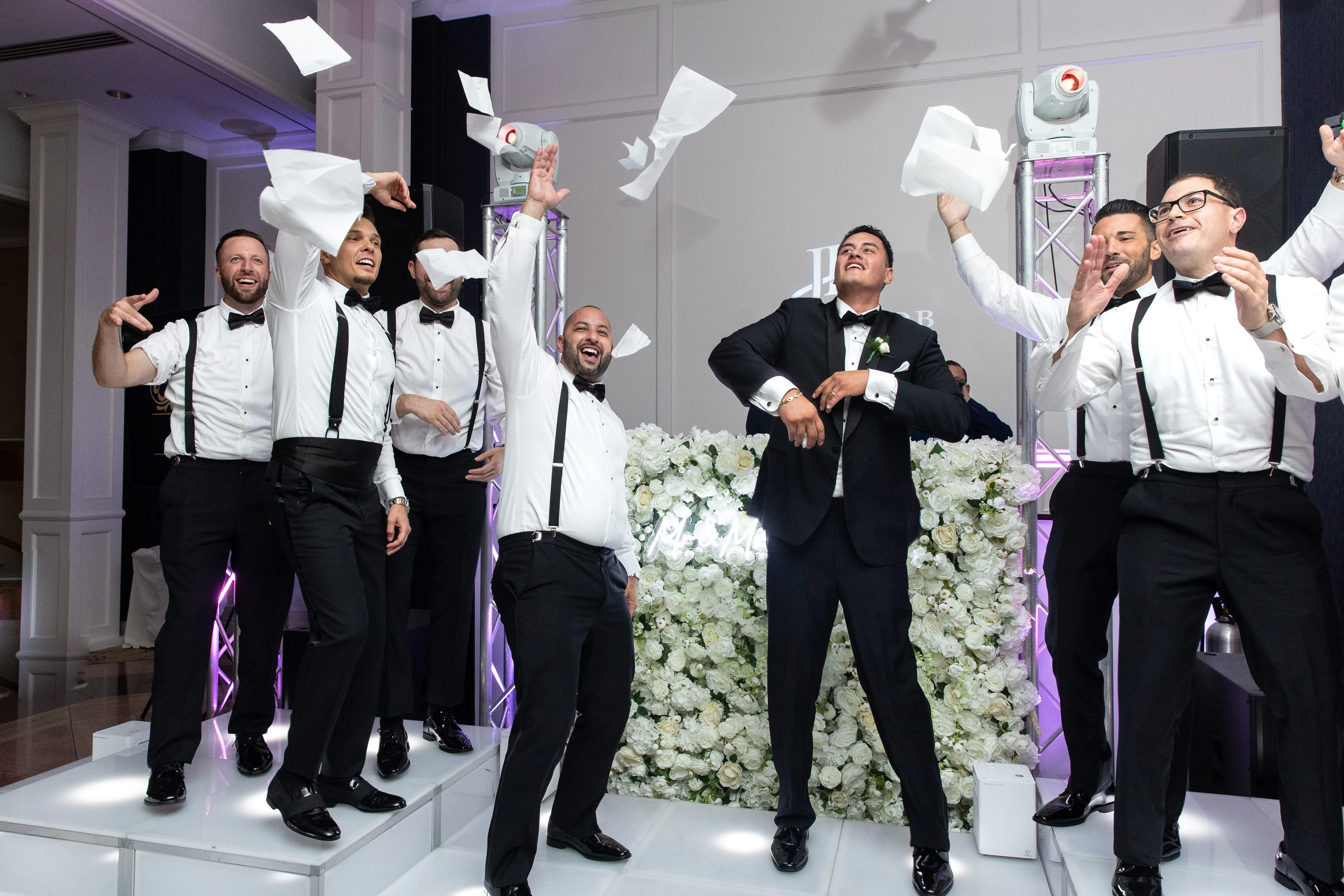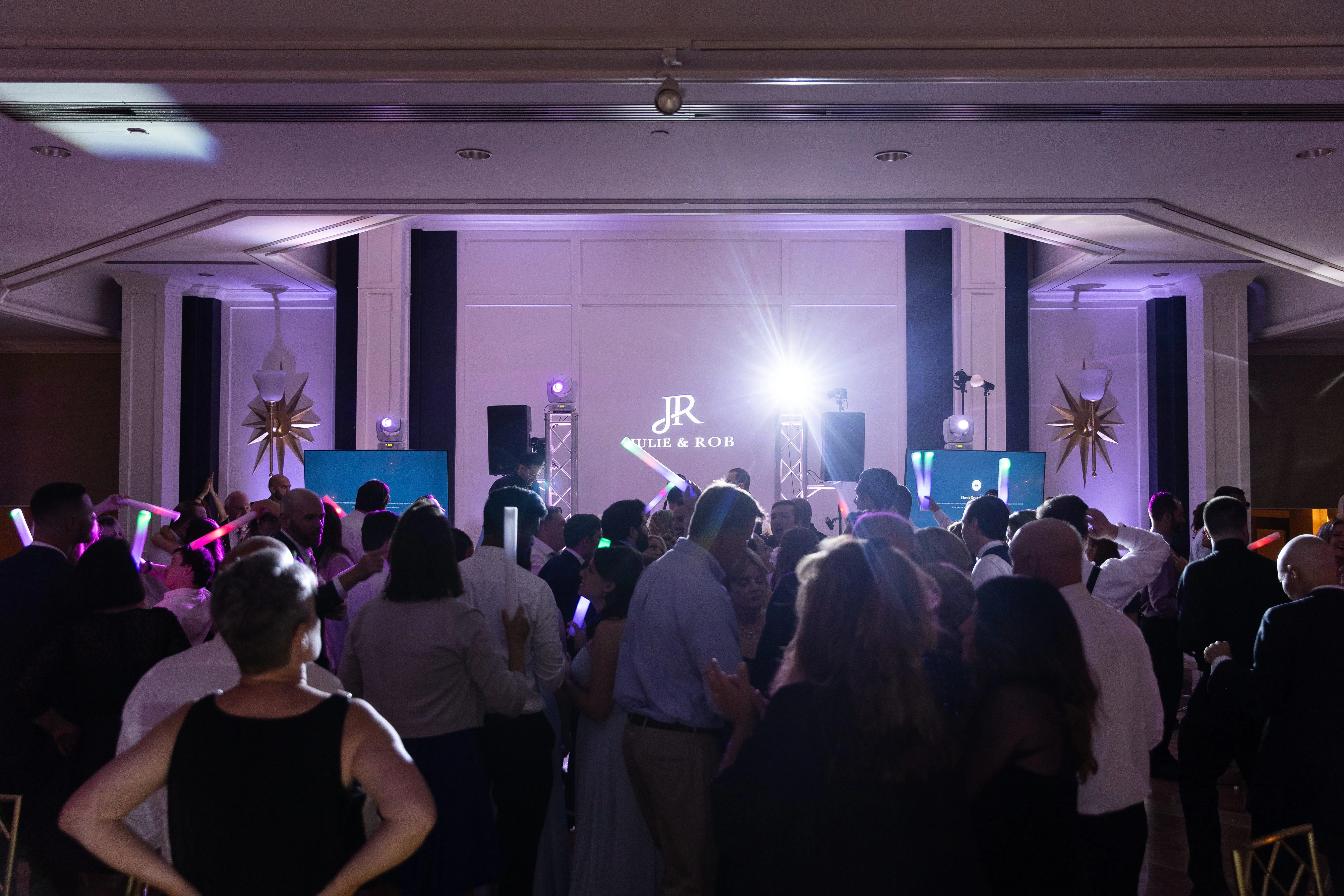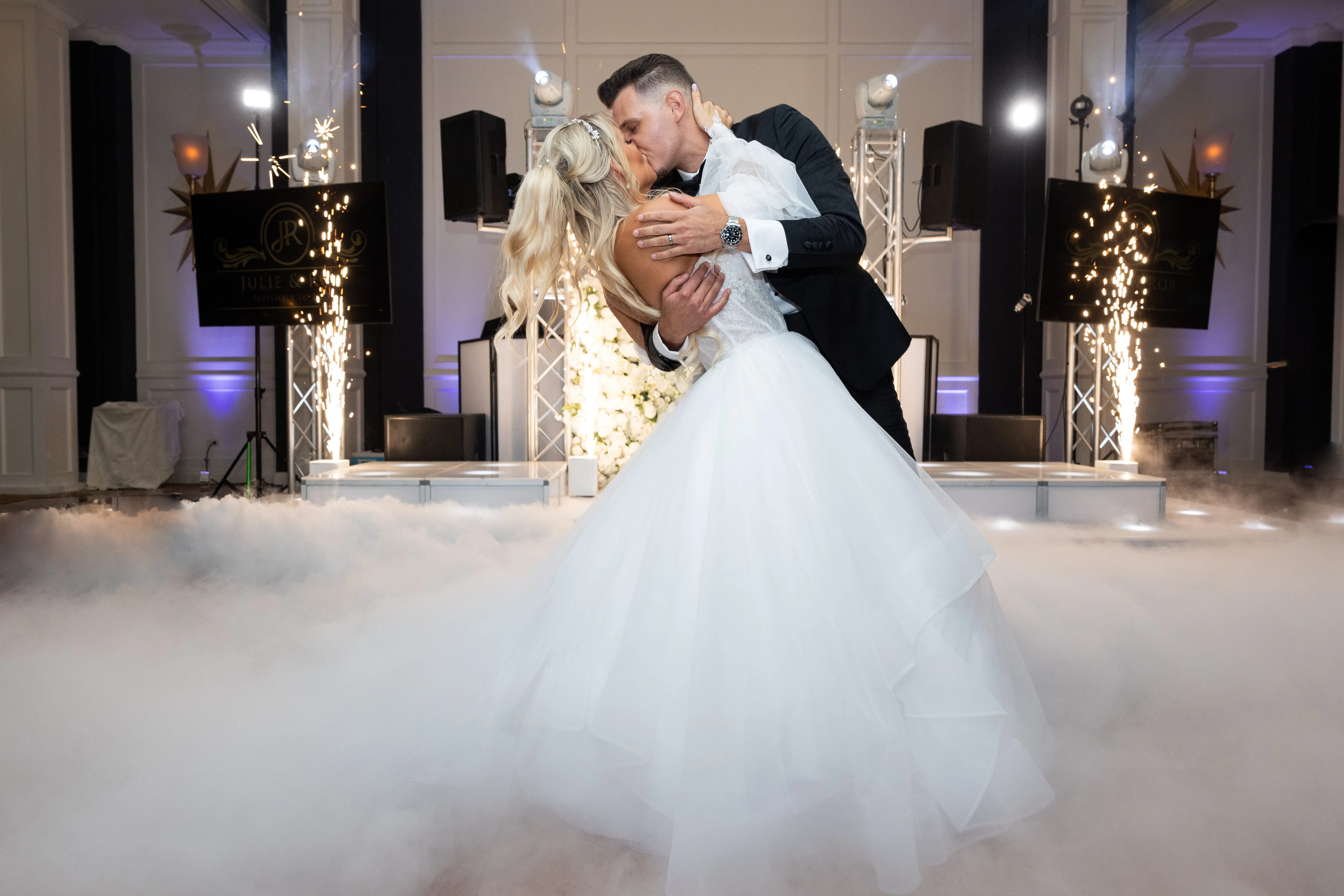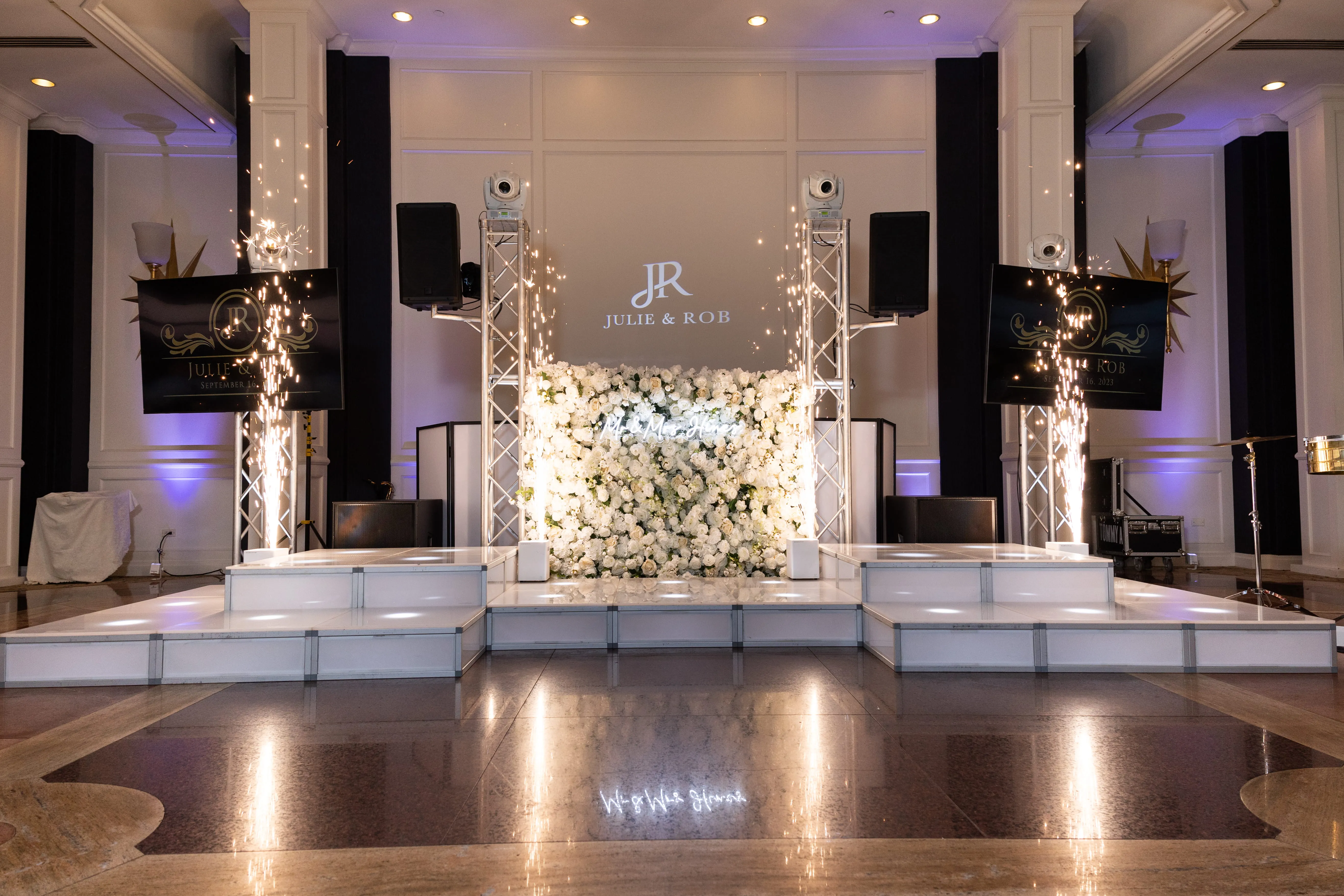 As the evening unfolded, the lighting took center stage, with a custom monogram illuminating a massive wall behind the DJ booth and white uplighting that perfectly complemented the event's theme. These meticulously planned and executed details underscored Rob Hines Entertainment's commitment to excellence, proving their ability to transform a couple's vision into a meticulously crafted, unforgettable celebration.