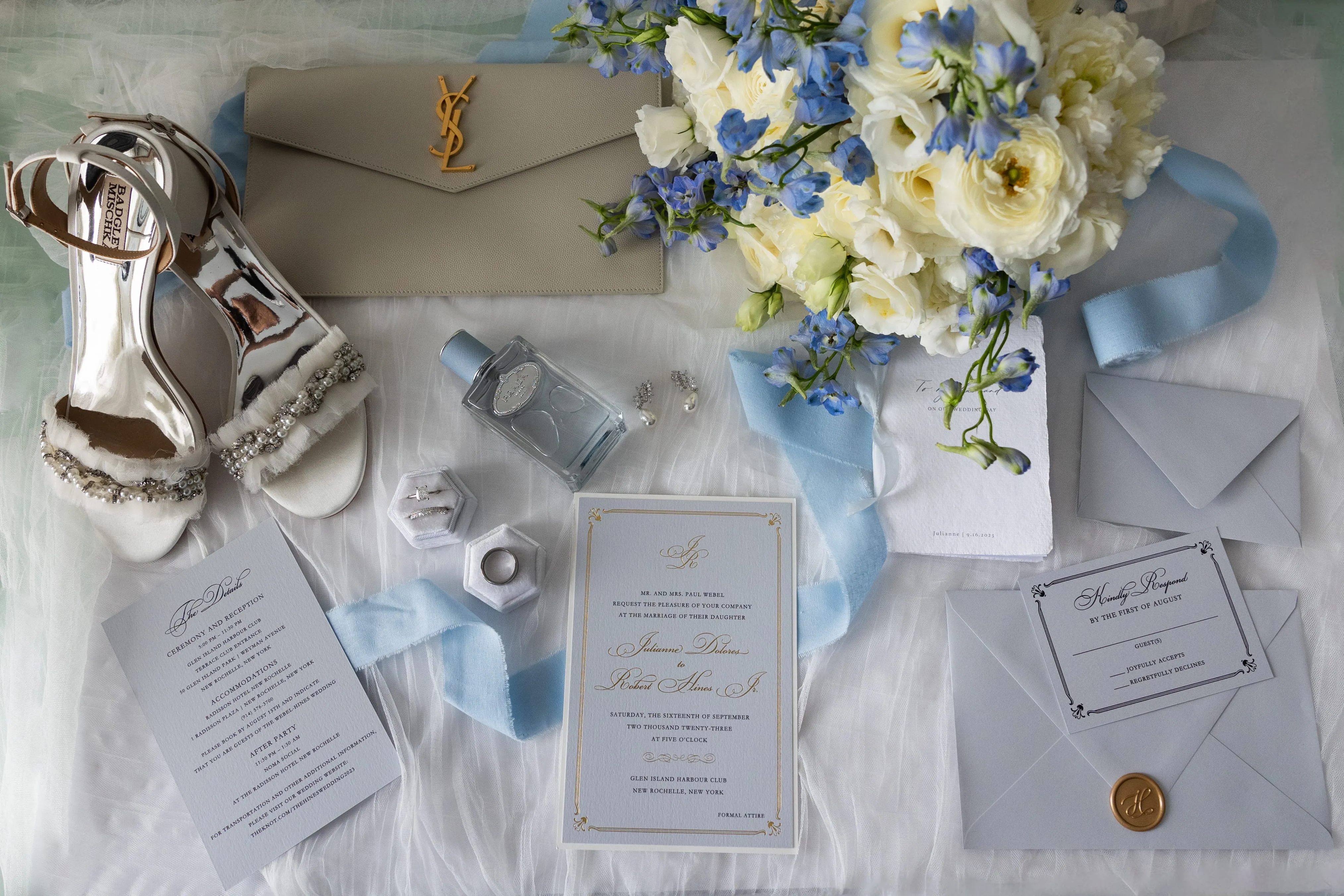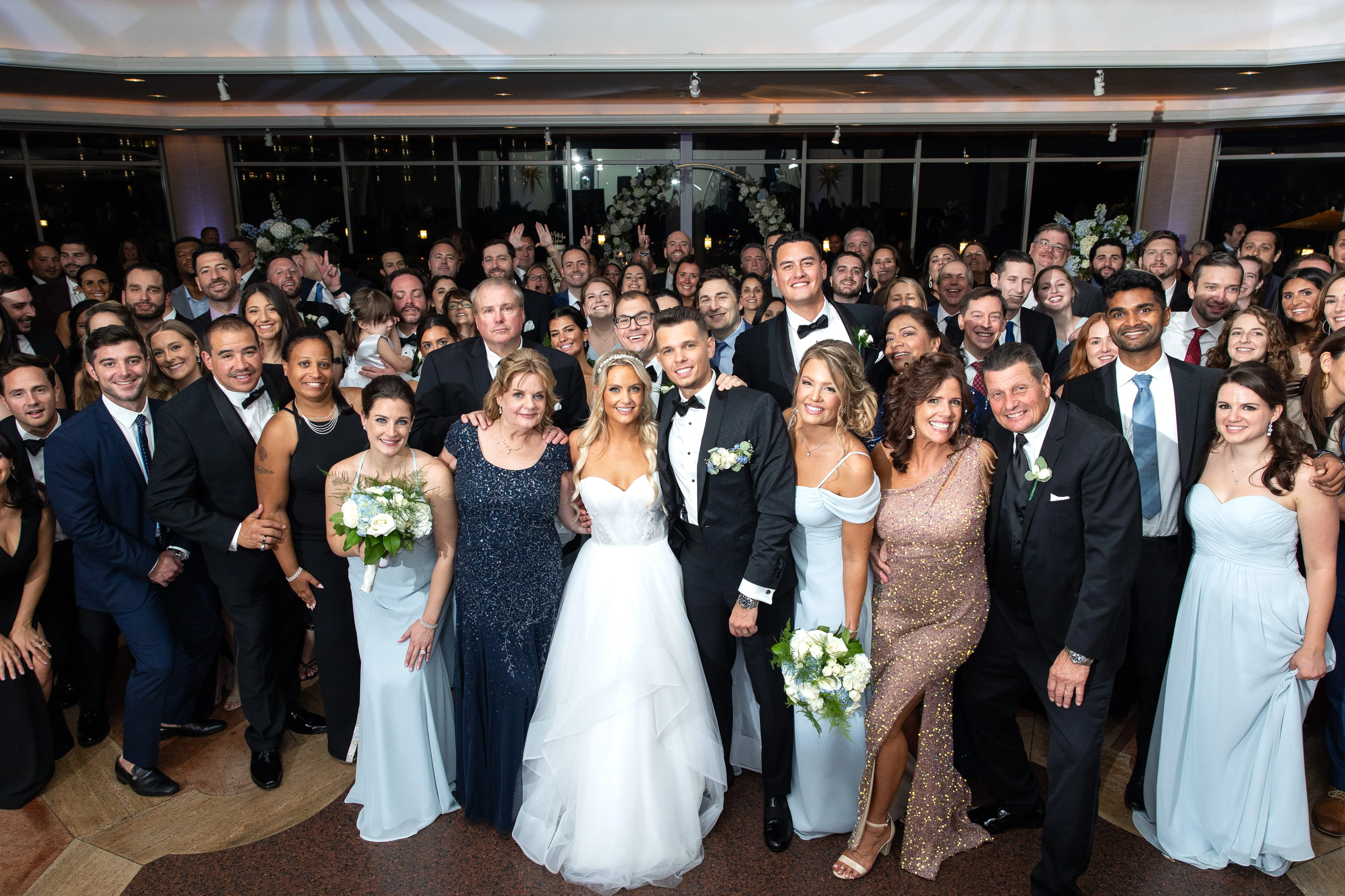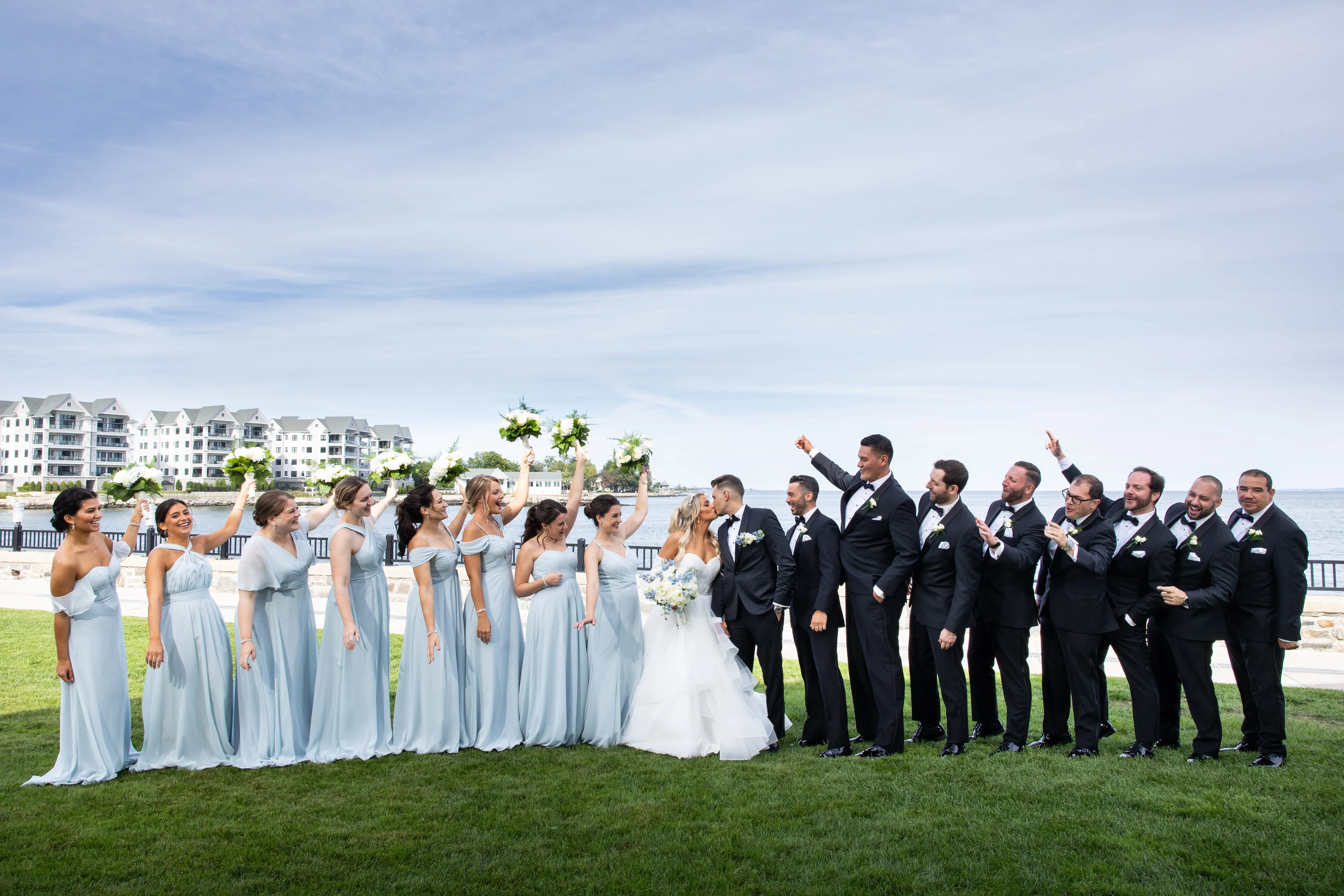 Rob Hines Entertainment collaborated closely with Rob and Julie, integrating a suite of services to seamlessly bring their wedding day vision to life, from the color palette to the theme. A unique all-white flower wall doubled as the DJ booth, harmonizing with the centerpieces to create an elegant atmosphere. Throughout the day, a comprehensive photo and video team, including an aerial drone, captured every moment from multiple angles, showcasing stunning views of the Long Island Sound at sunset. The photo booth further personalized the experience with custom strips and a unique backdrop, ensuring memorable keepsakes for guests.