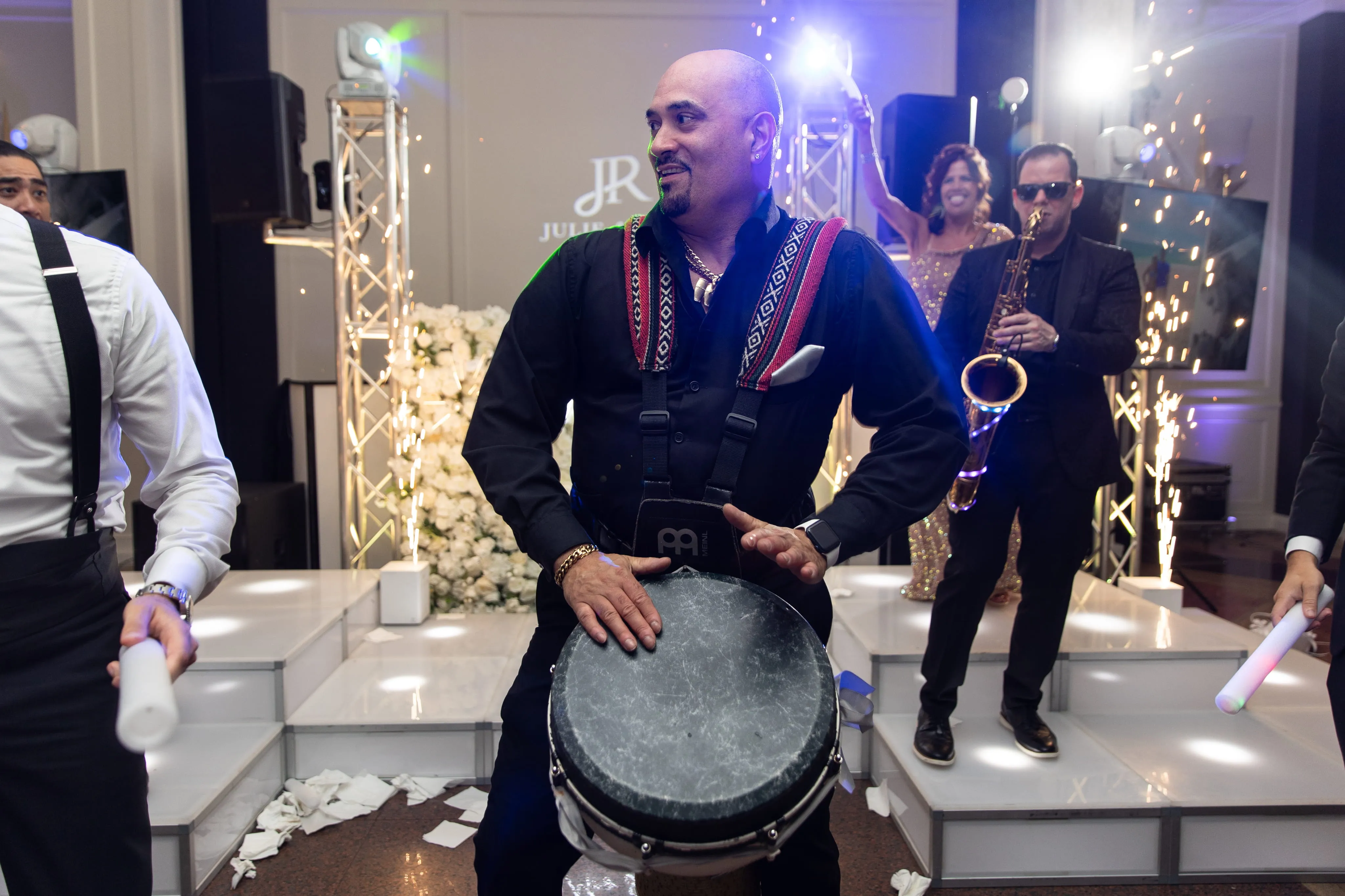 The dance floor was alive with energy, thanks in part to a vibrant percussion set that drew the crowd in, creating a dynamic atmosphere that resonated well into the night. This, combined with the magical moment of Rob and Julie's first dance amidst dense, low-lying clouds and sparklers, left an indelible mark on the celebration. A private saxophonist performance and video screens displaying cherished moments added layers of personalization and entertainment, enriching the overall guest experience.